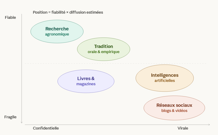 Ces  sources ne présentent pas les mêmes garanties. La tradition orale s’appuie sur des générations d’observations empiriques — ce qui lui confère une certaine robustesse — mais elle véhicule aussi des erreurs qui se sont transmises sans jamais être remises en question. La recherche agronomique offre des bases solides, mais ses conclusions, souvent formulées pour des contextes de production professionnelle, ne sont pas toujours transposables au jardin familial. Quant aux réseaux sociaux et aux IA,  ils amplifient à la fois les bonnes pratiques et les idées fausses avec la même efficacité algorithmique.
