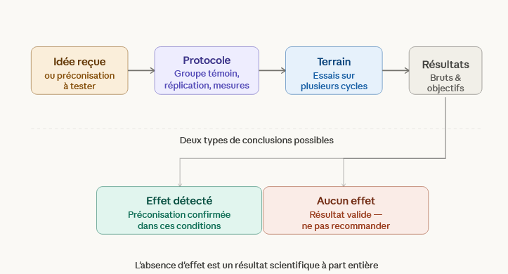 Toute préconisation mérite d’être questionnée, quelle que soit sa source. L’expérimentation locale avec groupe témoin, réplication et mesure objective reste le seul moyen fiable de savoir ce qui fonctionne vraiment dans votre jardin. L’absence d’effet est un résultat, pas un échec.