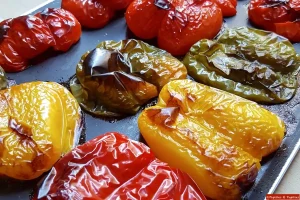 1. Griller les poivrons entiers au four à 220 °C (ou à la flamme) jusqu’à ce que la peau noircisse.